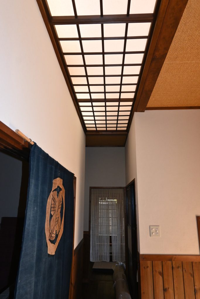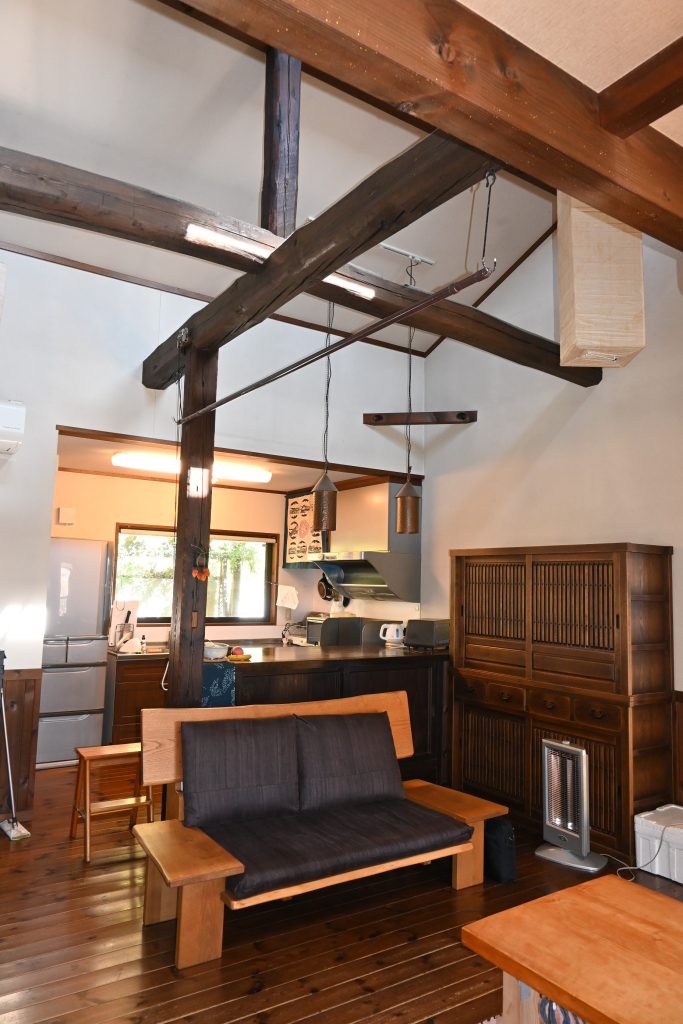 高い天井、太い柱と梁、厚い床板、玄関・土間・囲炉裏部屋の造りに古民家の風情を感じます。約20帖のLDKの南側には屋根と窓付きの広々したサンルーム。