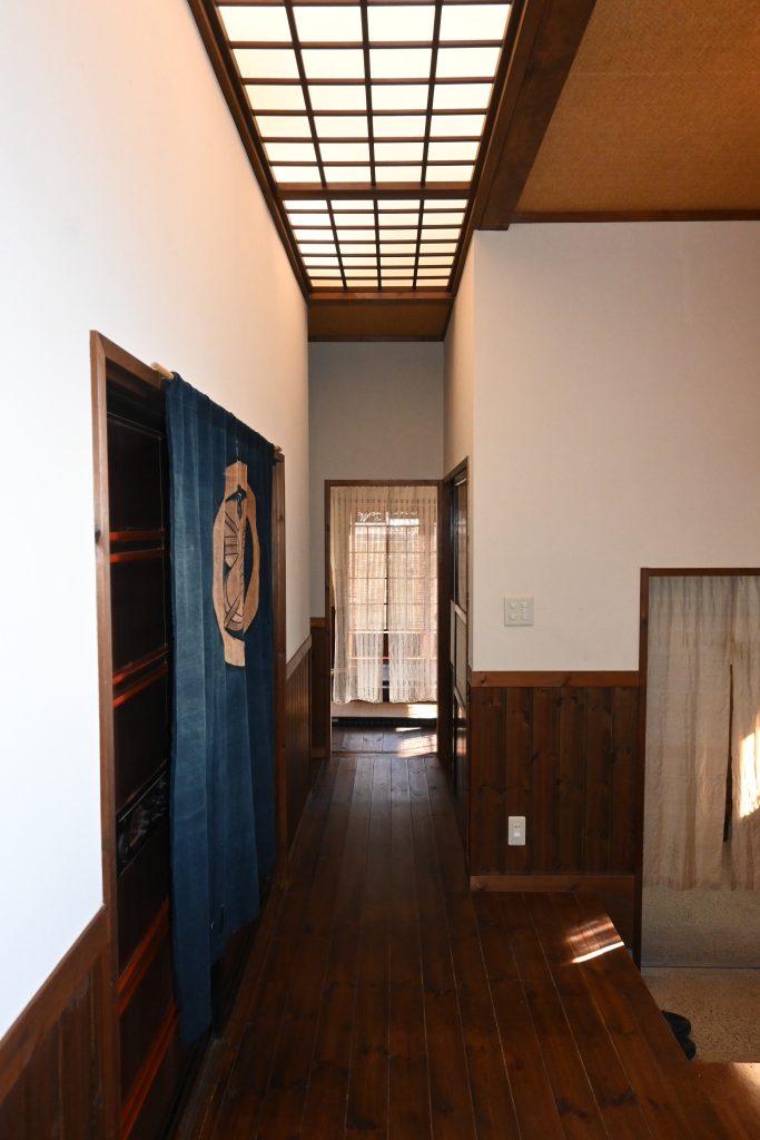 高い天井、太い柱と梁、厚い床板、玄関・土間・囲炉裏部屋の造りに古民家の風情を感じます。約21帖のLDKの南側には屋根と窓付きの広々したサンルーム。