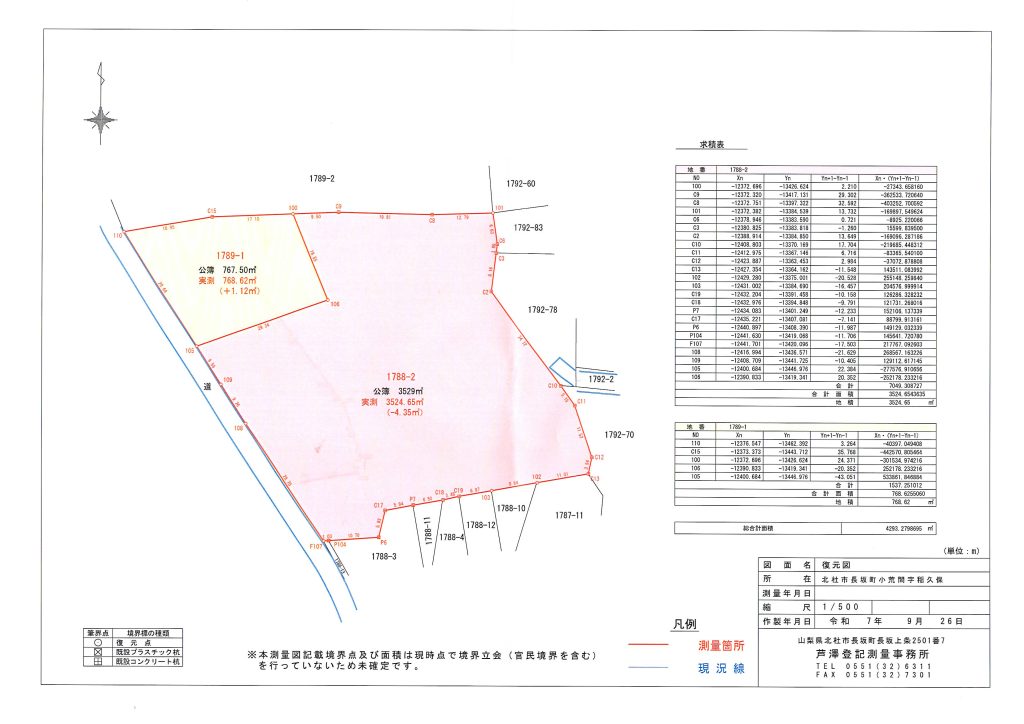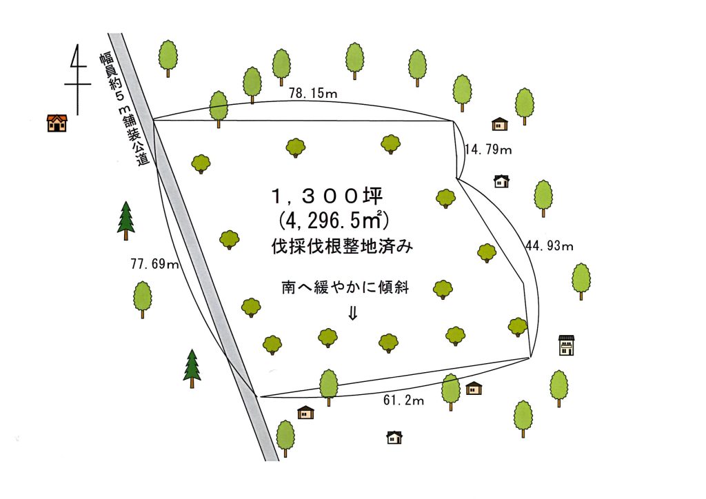 | 現況 | 伐採伐根整地済み | 地目 | 宅地(1789-1)、山林(1788-2) |