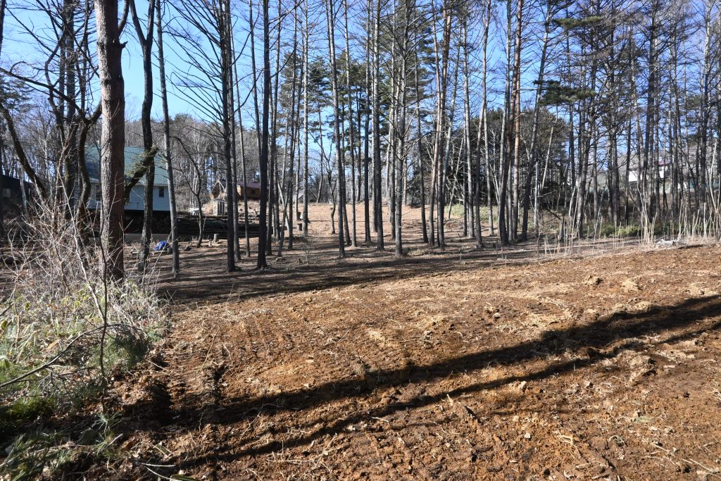 舗装公道から未舗装公道を80m程進んだ明るい静かな林間で、敷地内の樹木は全て伐採伐根済み。